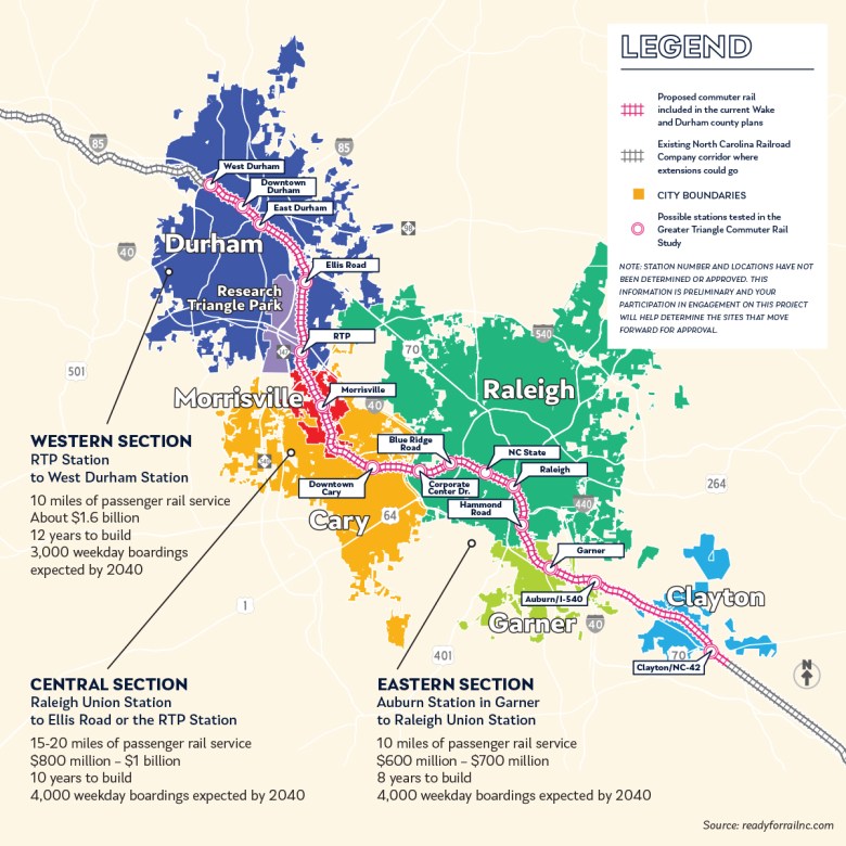 The proposed rail runs 37 miles from Garner to Durham and requires cooperation from Johnston, Wake, and Durham county commissioners.