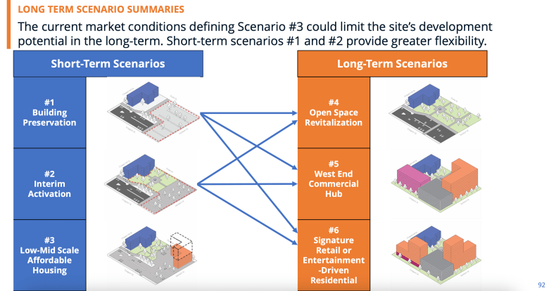 HR&A presented council with three short-term options for the site: Preserving the Milton Small building, preserving the building and adding open space for interim uses, and creating affordable housing in addition to open space and the existing building. They also presented three long-term scenarios, each preserving the Milton Small building: One maximizing open space, one creating a “commercial hub” on most of the site, and another creating a dense, mixed-use development.