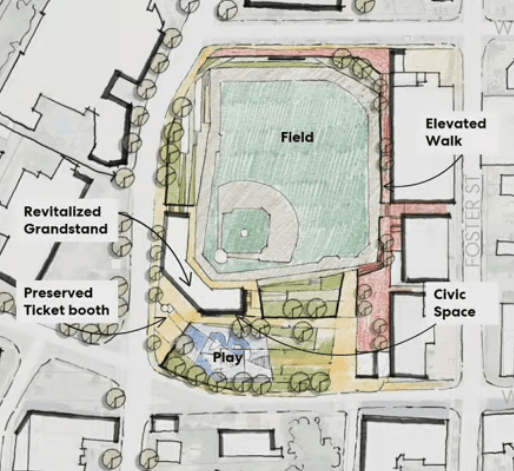 The two proposals that the council rejected called for removing the ballpark and using the site as a public space. The second proposal would keep the rough structure of the park but open it up to biking paths and walkways. The field itself would be converted to a large lawn for public events.