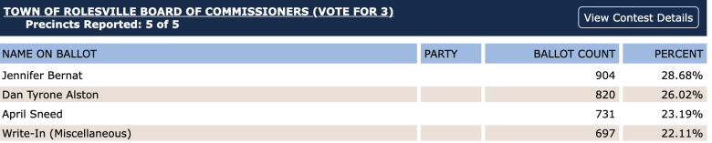 In Rolesville’s noncompetitive election for three seats on the town’s board of commissioners, voters still showed up. Their favorite candidate was local boutique owner Jennifer Bernat, who won 29 percent of votes, followed by incumbent financial coach Dan Alston (26 percent) and mayor pro tem April Sneed (24 percent), who is also a financial services professional. Write-in candidates won 697 votes, a full 22 percent of the vote share.