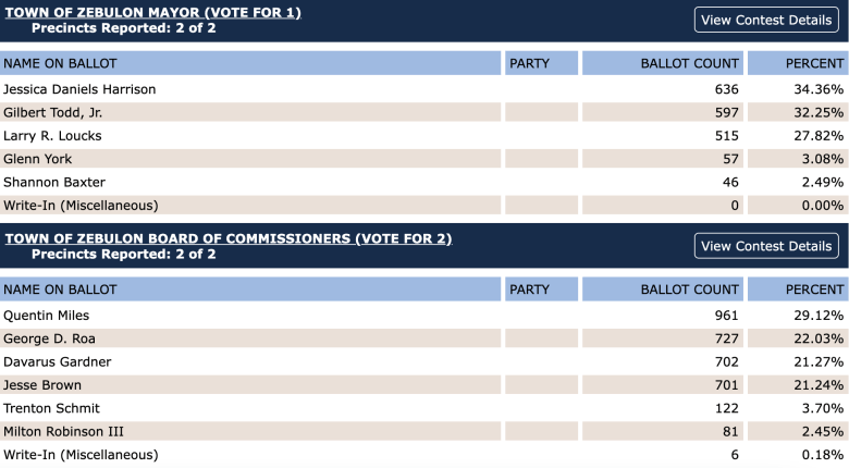 Finally, the small but growing eastern Wake County town of Zebulon—where incumbent mayor Glenn York placed second to last out of five candidates—saw the messiest mayoral contest in this municipal election cycle by far. Sitting commissioner and current mayor pro tem Jessica Daniels Harrison won the seat last night with about 34 percent of the vote, but it was a victory few could have predicted.