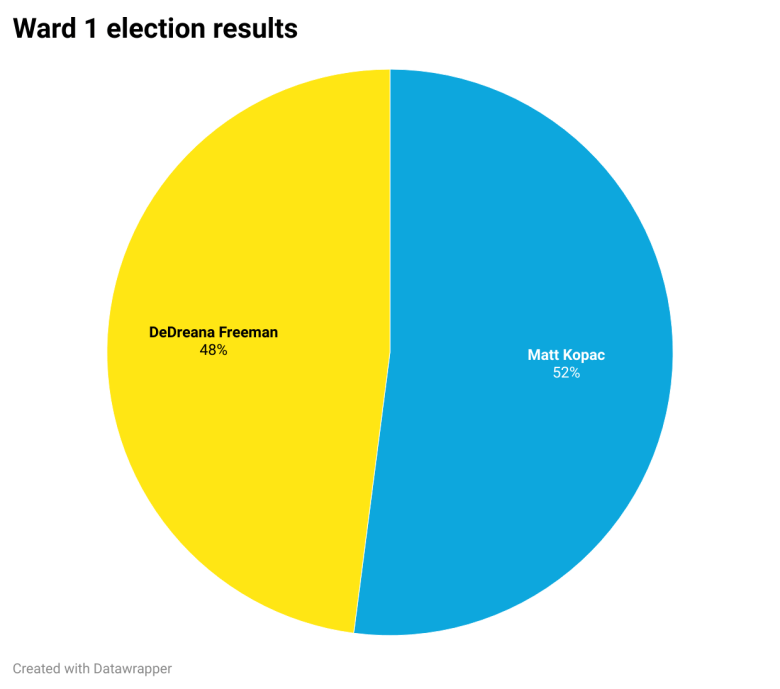 For ballots cast on Election Day by Ward 1 voters specifically, Kopac received just 741 more votes than Freeman out of 10,247 cast (which does not include write-in or early votes).