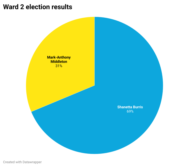 Two other sitting councilors, DeDreana Freeman and Mark-Anthony Middleton, were ejected from their seats. Freeman lost a close contest against Matt Kopac in Ward 1, and Shanetta Burris won handily in Ward 2 against Middleton.