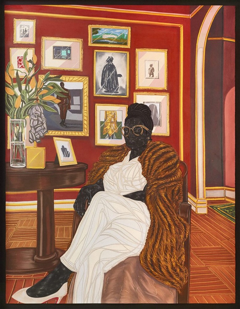 “The Marchioness” is a portrait—created with charcoal, pastels, and pencil—of an elegant Black woman in a silky, white pantsuit with a fur stole draped over her arms, sitting in a lavish room. It’s part of a larger series that depicts two fictional aristocratic Nigerian families whose world offers an alternative to the present—one where British colonial rule and the transatlantic slave trade never happened. The marchioness’s skin is created using a distinctive technique Odutola calls “mark-making,” in which the artist meticulously layers marks to build up a luminous dark surface.