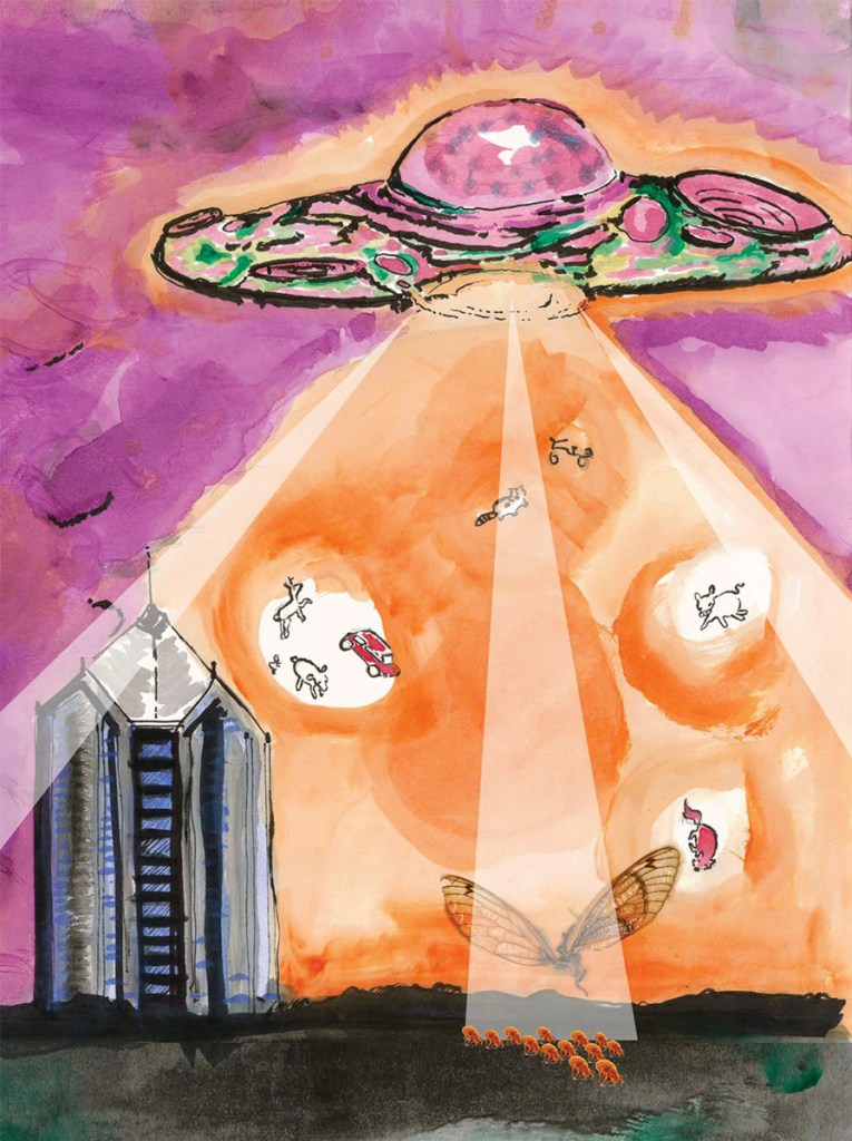 One science-fiction comic in the magazine, created by daughter-father duo Alegría Rojas-Patino and Miguel Rojas Sotelo,shows pieces of the city—Duke Chapel, the Lucky Strike water tower—taking off into space like rocket ships. Another piece shows the results of a community portrait studio set up in various locations around Durham.