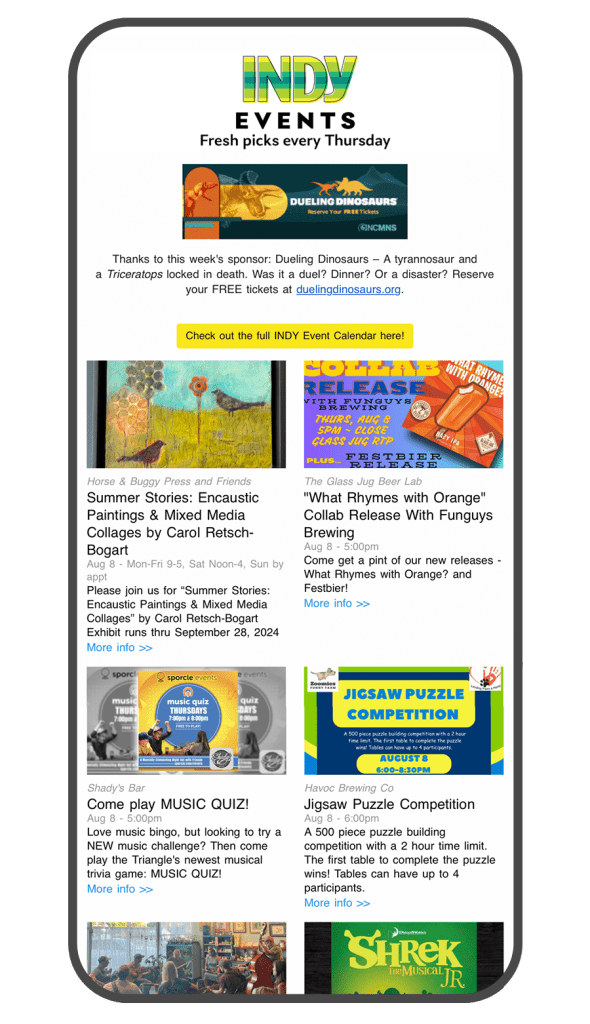 Sign up for INDY’s Events Newsletter Sent Thursdays, the Events Newsletter helps you plan ahead with our curated guide to local happenings. Sign up