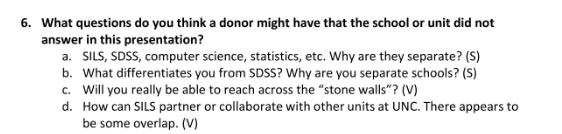 “Why are you separate schools?” wrote one attendee who was asked to predict questions that donors might have. Another wanted to know more about the “broader vision” for data science and artificial intelligence at the university: “How does SILS fit into that picture?”